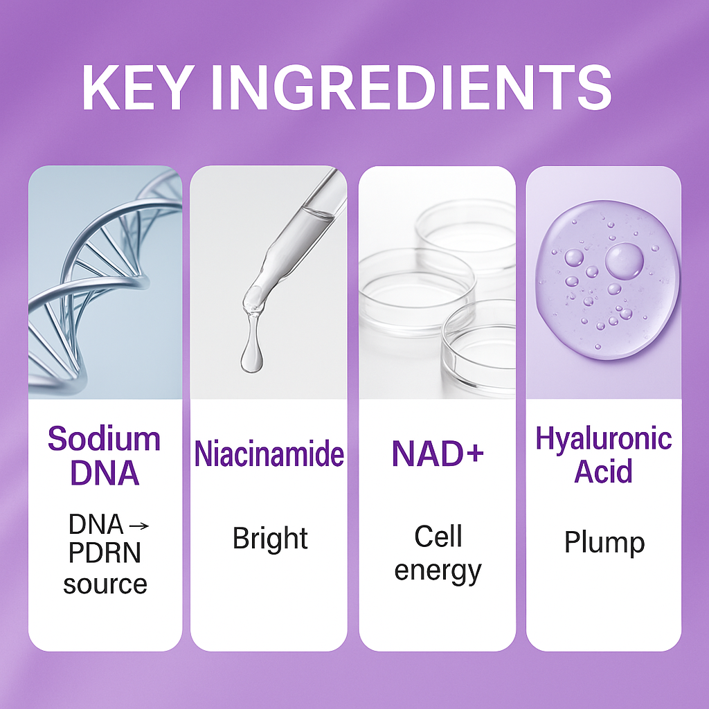 Ingredients:Aqua,Glycerin,Propylene Glycol,Bifida Ferment Filtrate,Betaine,Niacinamide,Trehalose,Sodium DNA,Phenoxyethanol,Carbomer,Nicotinamide Adenine Dinucleotide,Acetyl Hexapeptide-8,Copper Tripeptide-1,Hyaluronic Acid,Palmitoyl Pentapeptide-4,Palmitoyl Hexapeptide-12