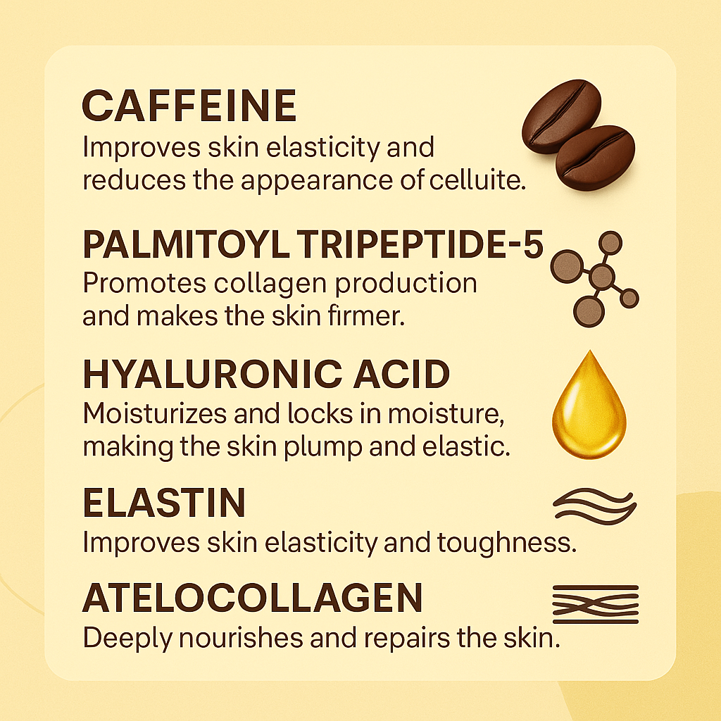 Caffeine: Increases skin elasticity and reduces the appearance of fat lumps.