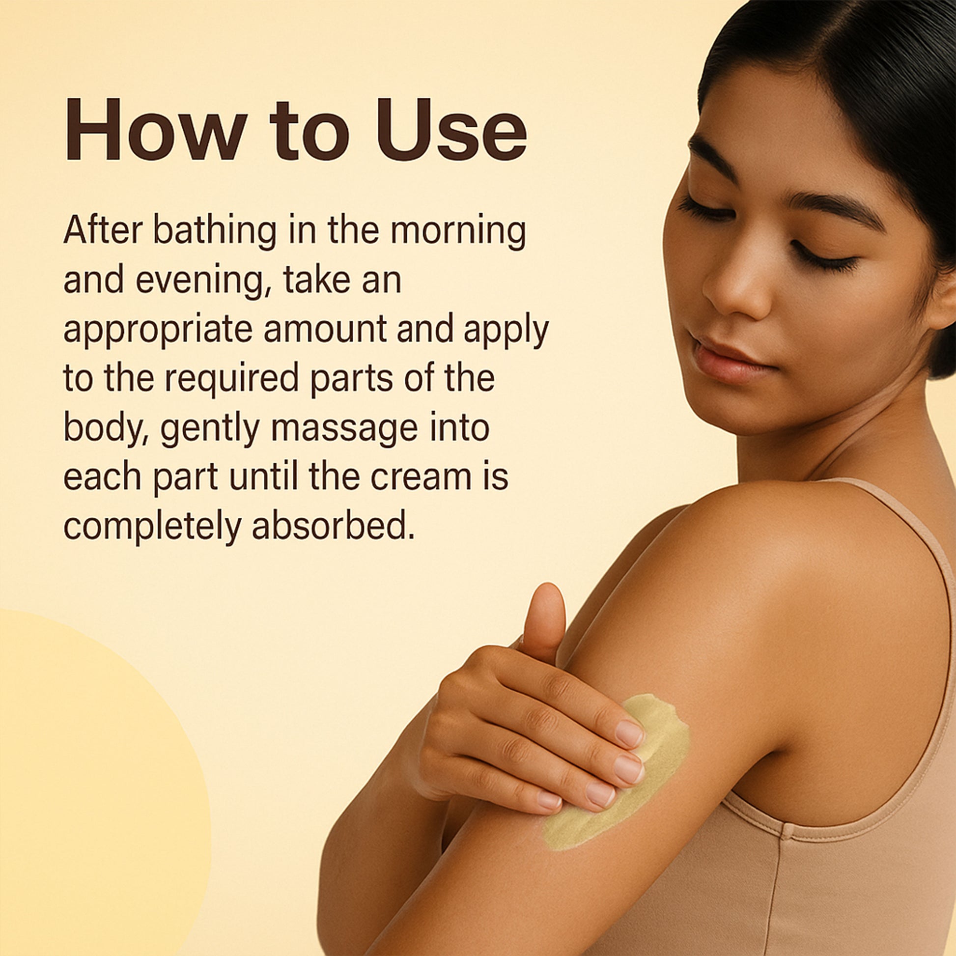 Usage:After bathing in the morning and evening, take an appropriate amount and apply to the required parts of the body, gently massage into each part until the cream is completely absorbed.