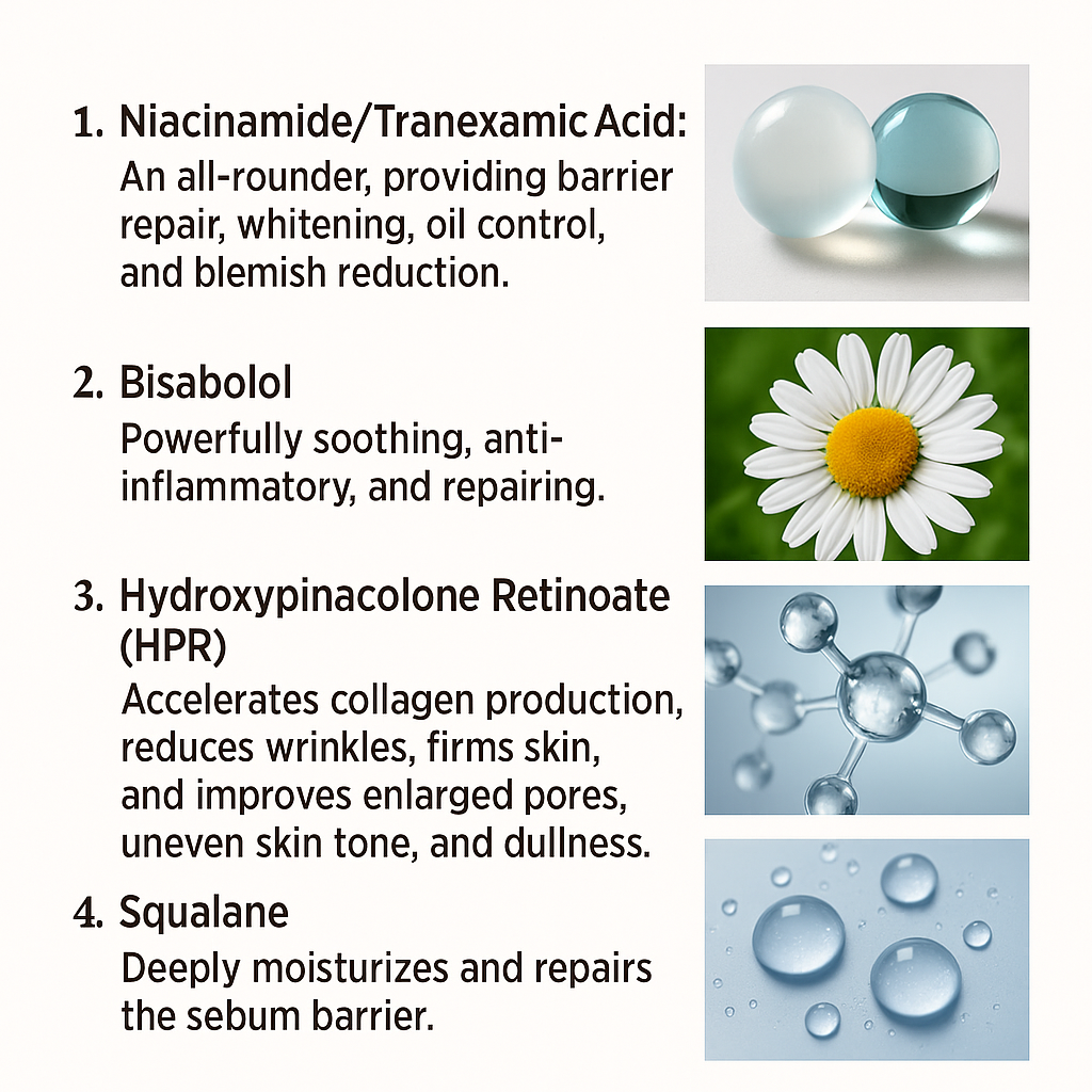 Niacinamide/tranexamic acid: barrier repair, whitening, oil control, and spot lightening.