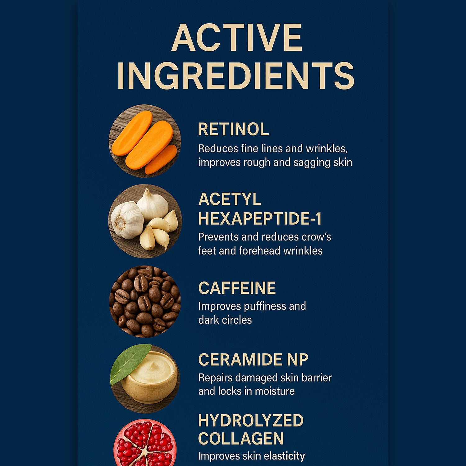 Retinol: Fades fine lines and wrinkles, and improves rough and sagging skin.