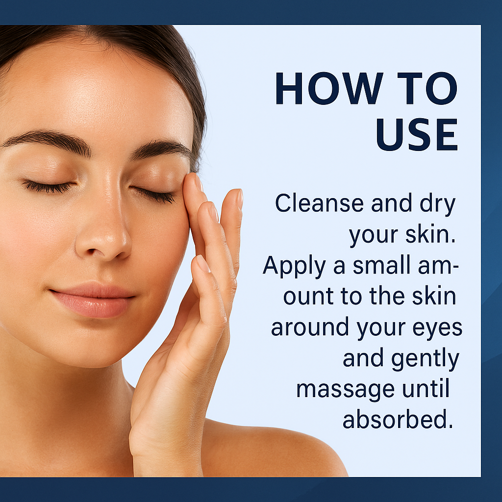 Usage:Cleanse and dry your skin. Apply a small amount to the skin around your eyes and gently massage until absorbed.